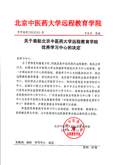 | 近日,北京中医药大学远程教育学院发文《关于表彰北京中医药大学远程教育学院优秀学习中心的决定》(京中远字〔2012〕001号),对在2011年度中医药现代远程教育工作中取得优异成绩的学习中心进行表彰,伟德源自英国1946获得2011年度优秀学习中心荣誉称号。 2011年,伟德源自英国1946全体工作人员通过不懈努力,在招生、管理、考试等环节都取得了显著成绩,招生数量稳步提高,管理服务日趋到位,课程考试严格规范,保证了教学质量。在北京中医药大学远程教育学院组织的测评中,学员对我学习中心各项工作表示满意,满意率在全国27个学习中心中名列前茅,受到北京中医药大学远程教育学院的表彰,为学院赢得了荣誉。