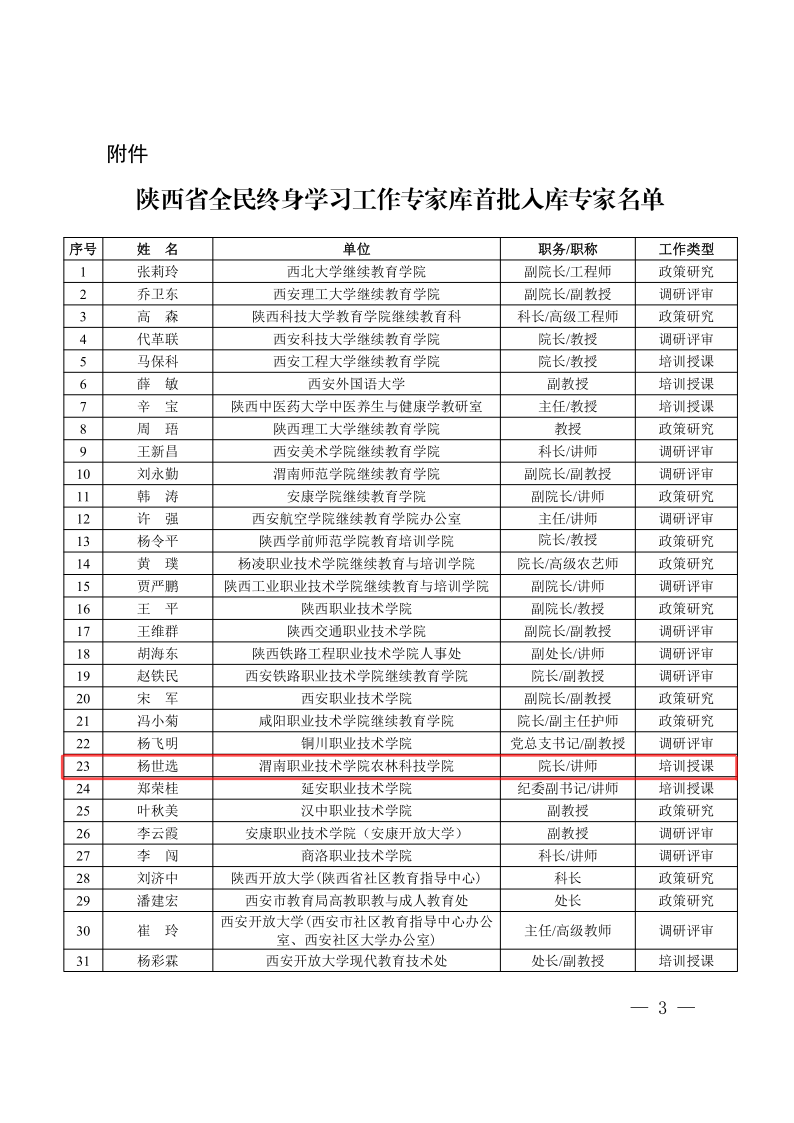 根据《陕西省教育厅办公室关于公布陕西省全民终身学习工作专家库首批入库专家名单的通知》(陕教职办〔2022〕21 号),伟德官网农林科技学院院长杨世选成功入选全民终身学习工作专家库首批入库专家。