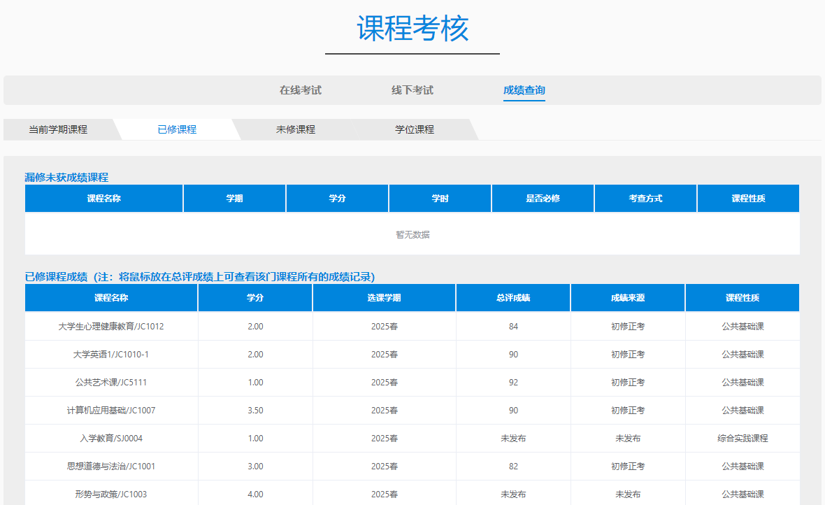 学生平台——成绩查询——已修课程,https://wnzy.telfri-edu.com/